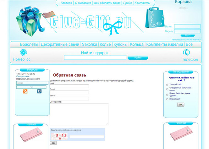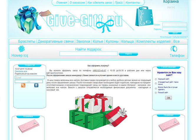 Шаблон для сайта подарков. Дизайн, верстка и шаблонизация под cms. Дизайн был создан под заказчика и его нужды. Разработка шла под новый интернет магазин.